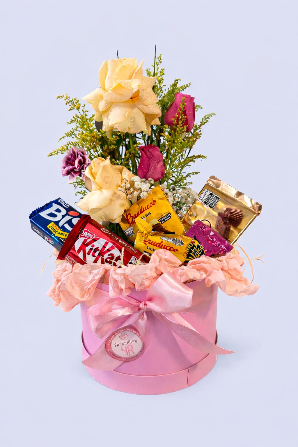A box além das lindas flores contém: 1 caixa de chocolate BIS, 1 Kit Kat, 1 barra de chocolate Alpino (80g), 1 bolinho Bauducco (40g) sabor chocolate, 1 pão de mel Bauducco (30g).