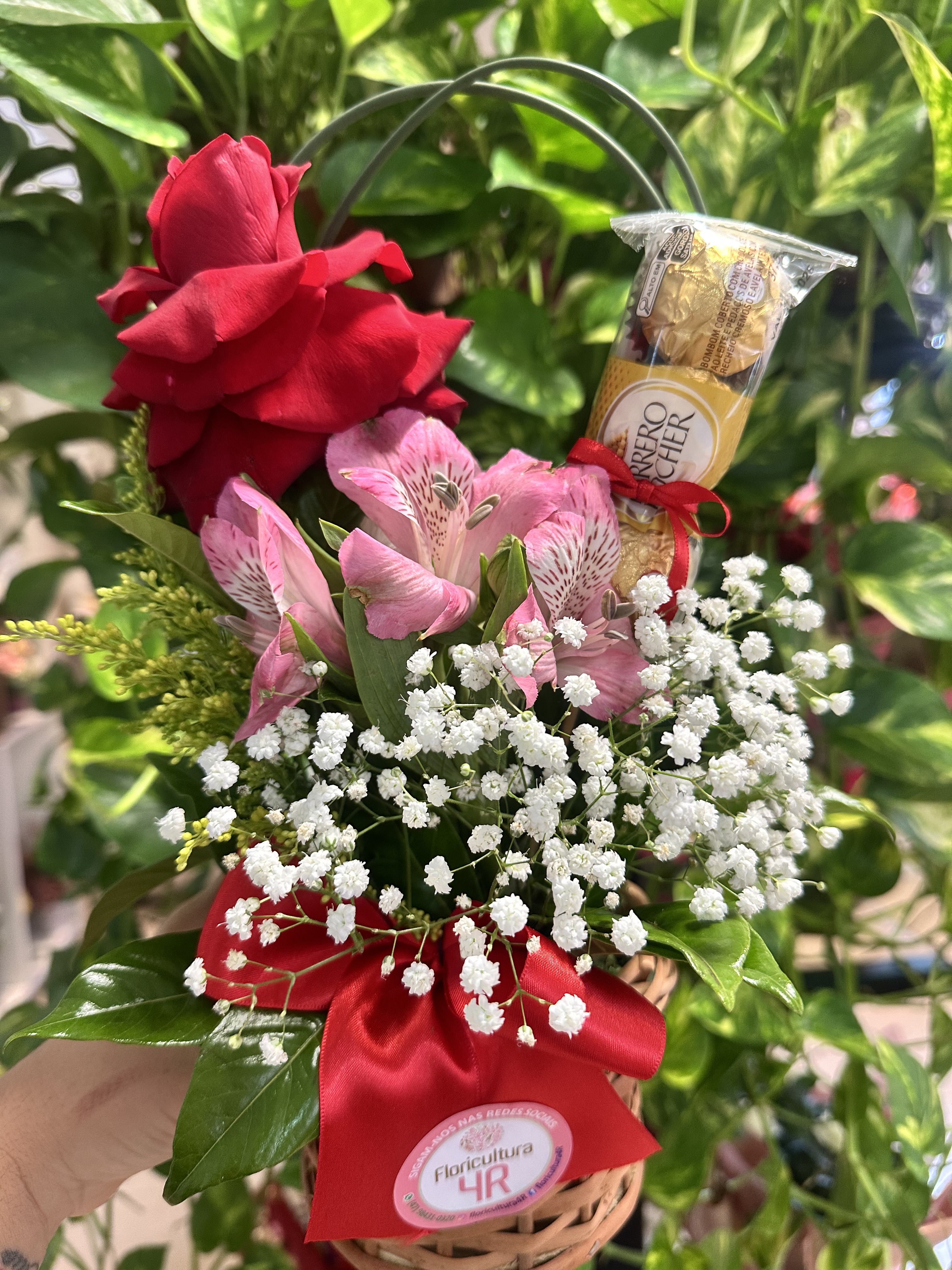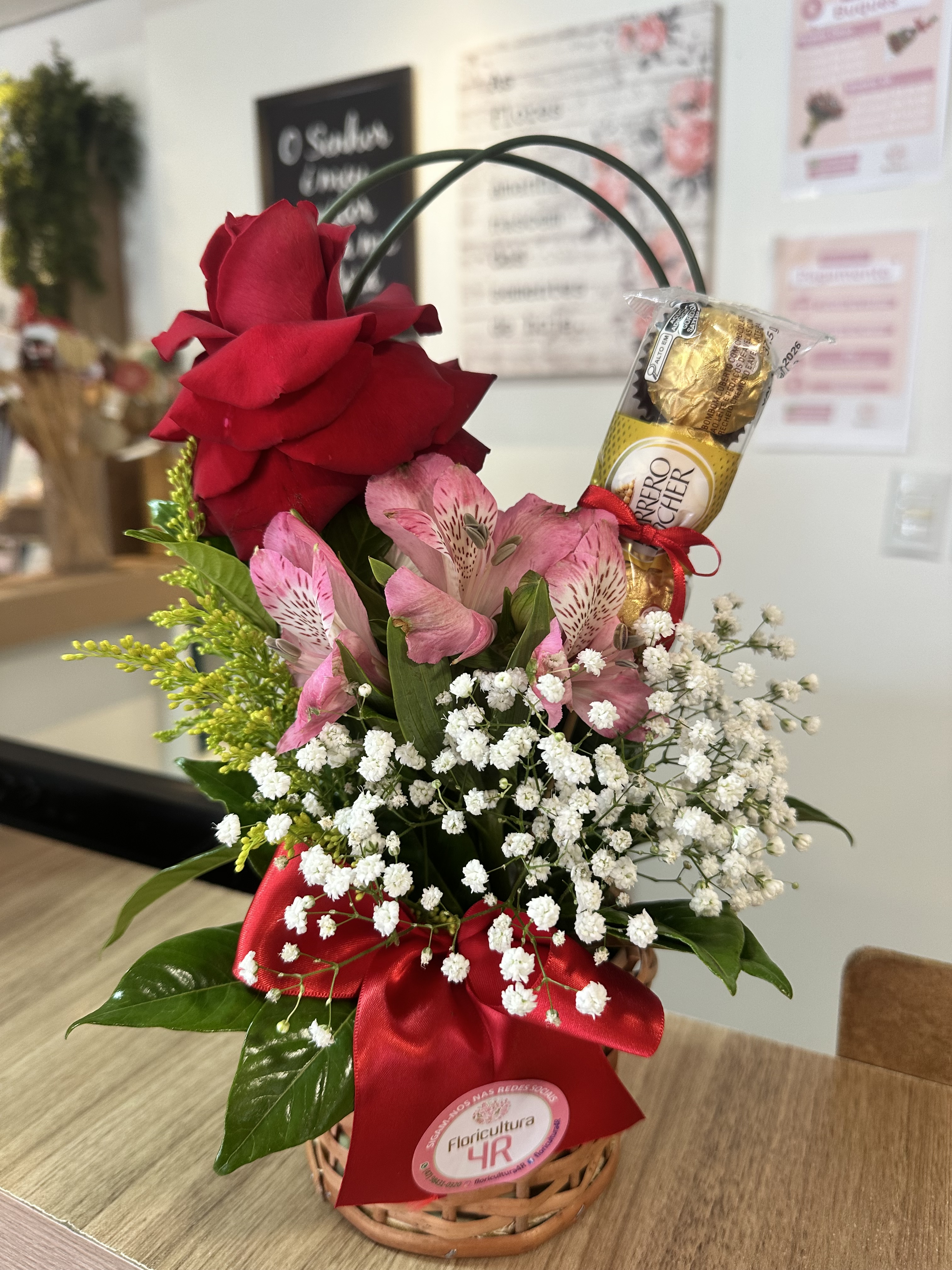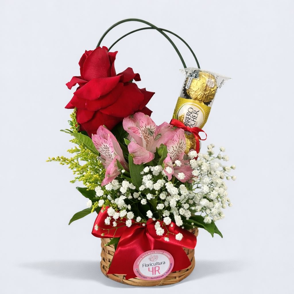 Uma opção de presente para qualquer ocasião. Arranjo com rosa e chocolate para entrega em Joinville.