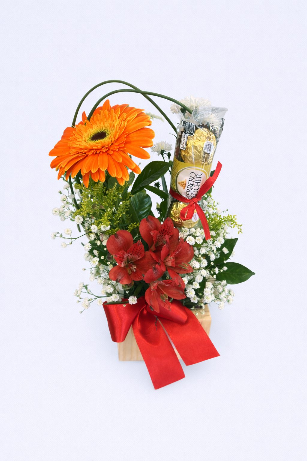 Uma opção de presente para qualquer ocasião. Arranjo com rosa e chocolate para entrega em Joinville.