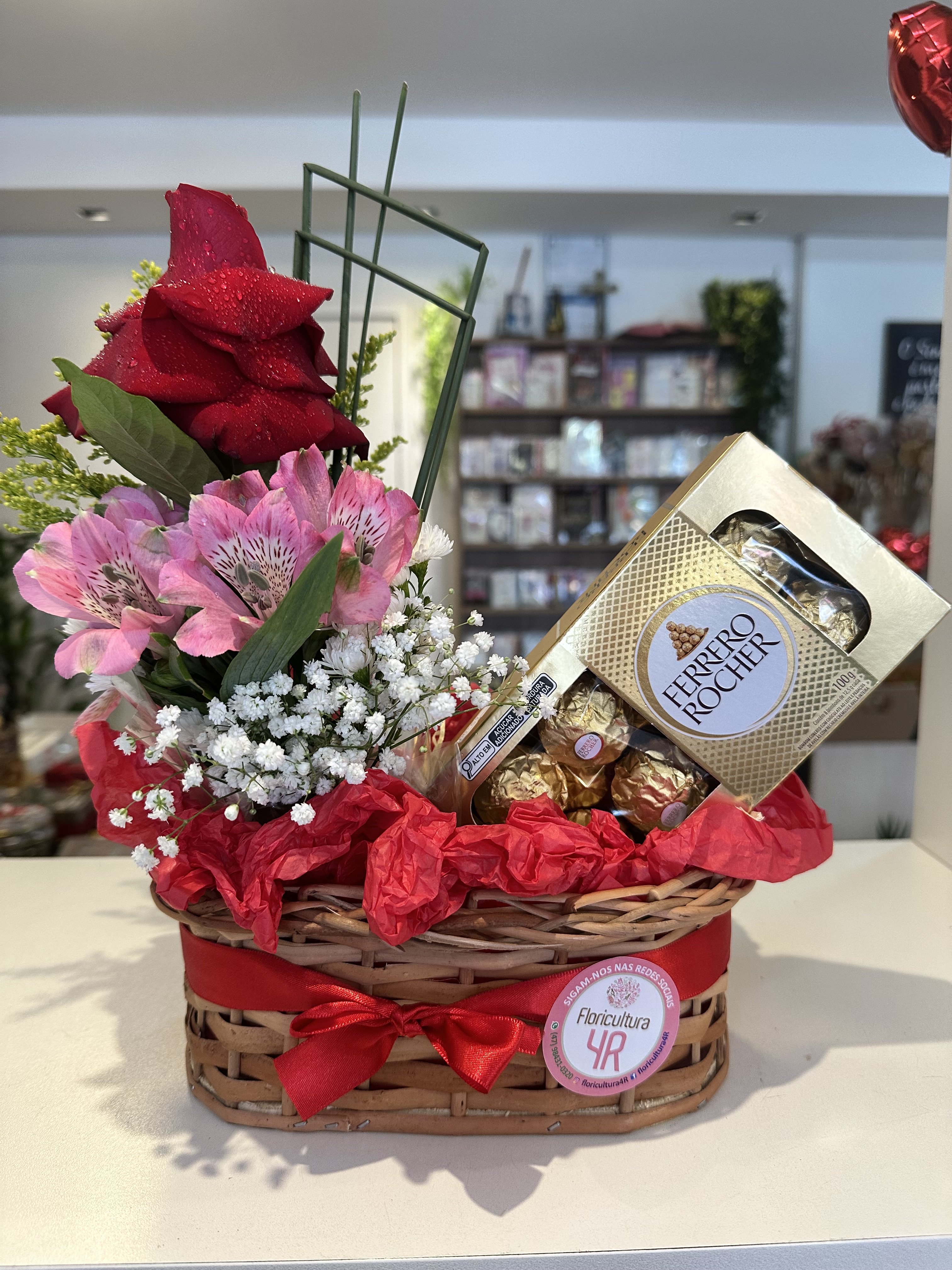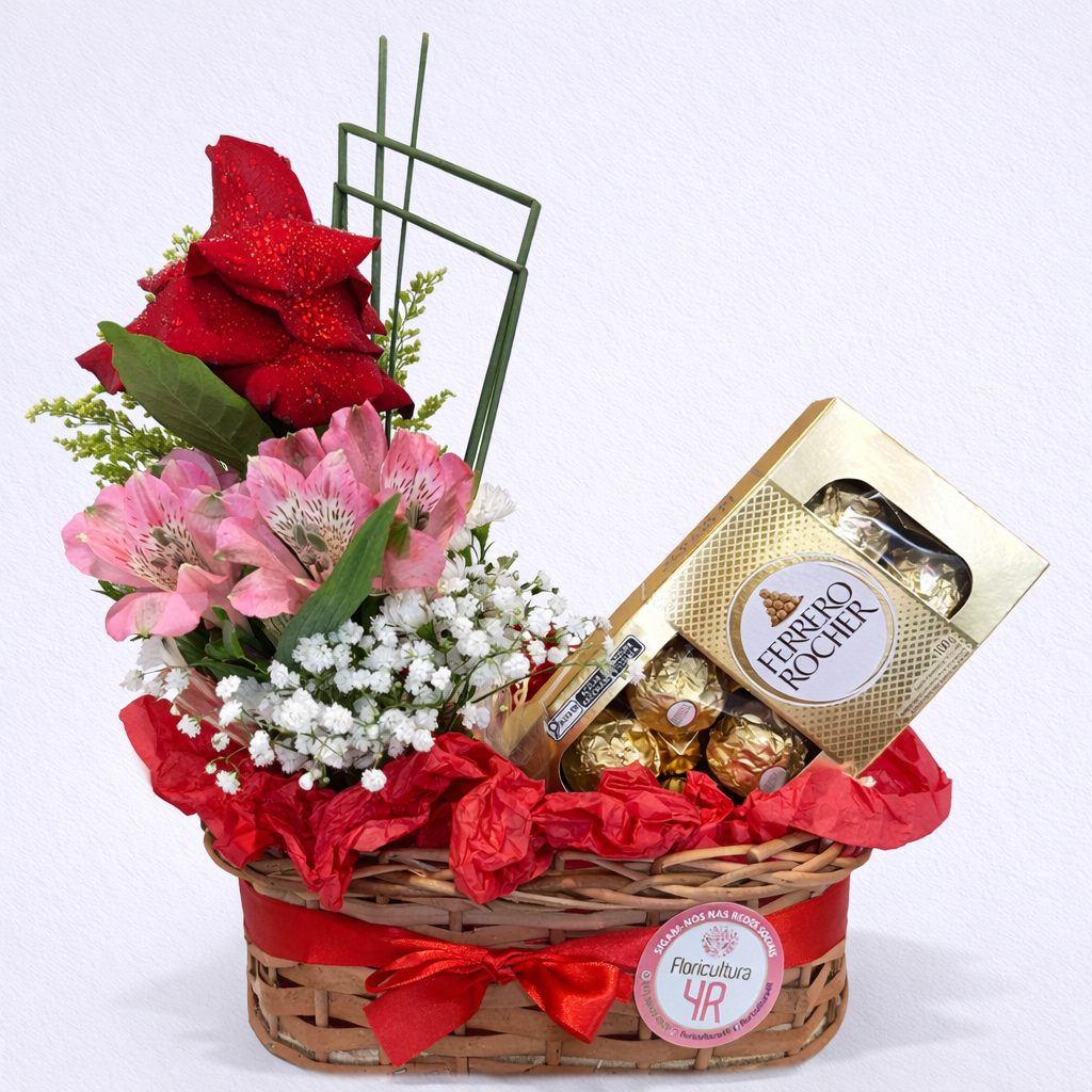 Uma opção de presente para qualquer ocasião. Arranjo de rosa com astromélia e caixa de Ferrero Rocher com 8 unidades.