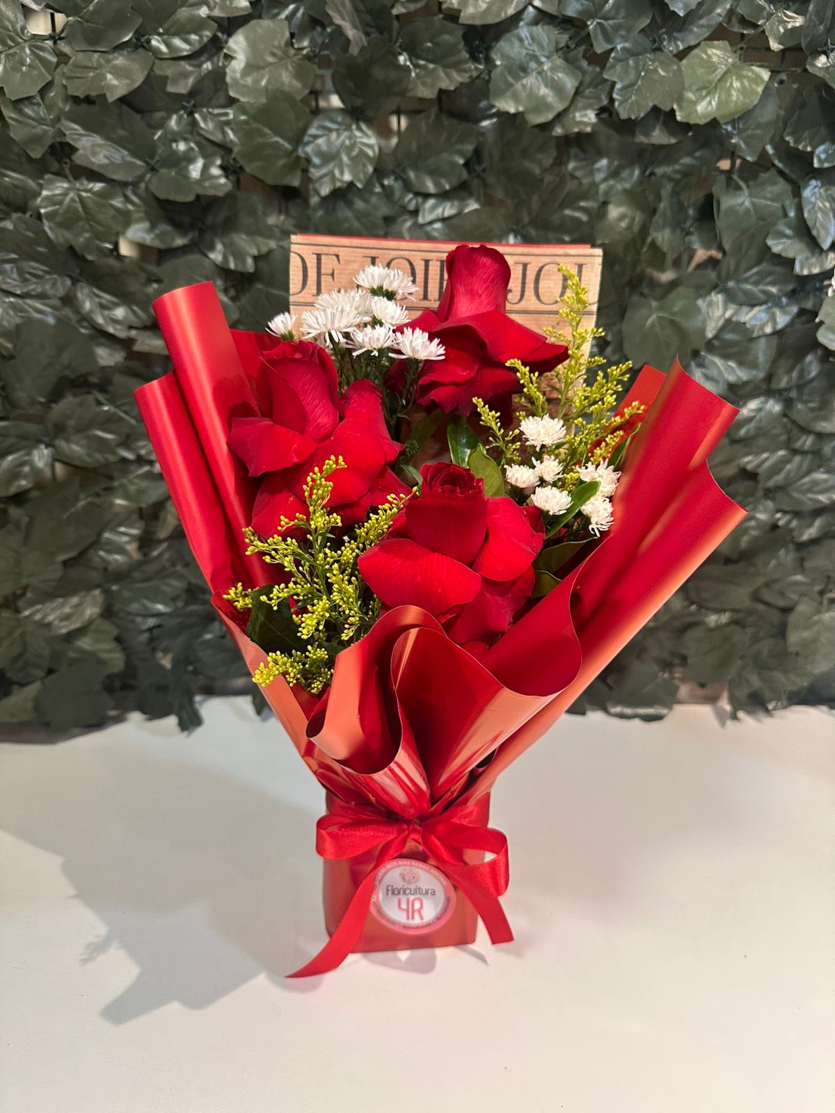 Um buquê que traduz o amor em sua forma mais intensa e elegante. Com 3 rosas vermelhas selecionadas, símbolo clássico da paixão, ele é delicadamente composto com flores complementares que trazem leveza e sofisticação à composição.