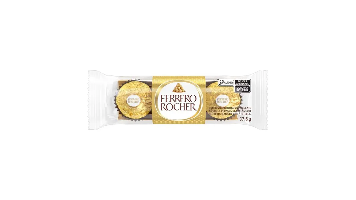 Pacote de bombons Ferrero Rocher (12,5 gramas cada) contendo 3 unidades.